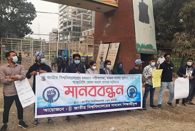 জাতীয় বিশ্ববিদ্যালয়ের প্রধান ফটকে বিভিন্ন কলেজের শিক্ষার্থীরা মঙ্গলবার সকালে স্থগিত পরীক্ষা শুরুর জন্য মানববন্ধন করেন